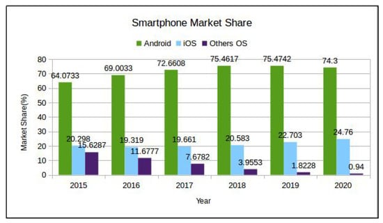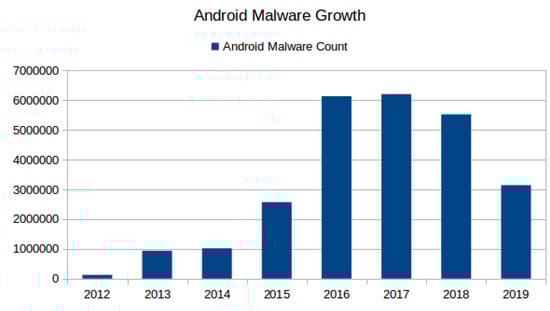 Malware binary is a compiled “set of instructions” or a “computer program” written intentionally to perform malicious activities that range from simple pop-up display to unauthorized access of the device [1]. In last two decades, malicious software has been targeting almost all kinds of computing platforms. Over a decade ago, the Android platform gained the majority market share of smartphone operating systems (OS) (see Figure 1—For 2020 only January data is used while for other years an average of 12 months data is used.)and has become the de-facto OS for smartphones (https://gs.statcounter.com/os-market-share/mobile/worldwide/2015). This popularity has attracted attackers and malware writers alike and resulted in exponential growth in Android malware (malware specially written for Android OS as the target is called Android malware). Figure 2 depicts Android malware growth from 2012–2019. Recent security threat reports from McAfee (https://www.mcafee.com/enterprise/en-us/assets/reports/rp-mobile-threat-report-2019.pdf) and Quickheal (https://www.quickheal.co.in/documents/threat-report/QH-Annual-Threat-Report-2019.pdf) stated not only a rise in Android malware, but also a significant rise in its complexity and scope, e.g., McAfee’s highlighted that the creation of recent mobile malware involves broader groups than an individual attacker who is simply spying, or sending premium SMS from the victim’s mobile phone.