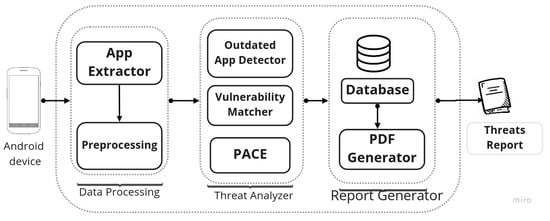 Data processing has two main components: App Extractor and Pre-Processing. The App Extractor component uses the ADB interface to extract all the installed apps on the attached smartphone. It is very similar to the ADB interface of PACE, so adding a reporting module to PACE would be very simple, but currently PACER is implemented as a separate tool for simplicity and ease of use. The Pre-Processing component performs functions like extracting app name, version, etc. which can be used in the Threat Analyzer module for vulnerability matching, outdated app detection, or getting a malware classification result from PACE.