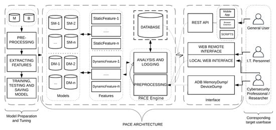 The targeted users are divided into three main groups i.e., General User, IT Personnel and Cybersecurity Professional, and Android malware researcher. Each group of users can be served by different methods available in the interface module. The grouping of users is purely based on ease of use and their preferred method; for example, the general user can access PACE services via the online web interface or through the Android application, which is very simple, and user will be comfortable, while on the other hand, the researcher can use a local web interface or ADB-based method to speed up their research work by bulk analysis and scanning.