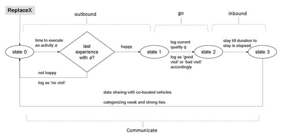 The vehicles at state ’3’ initiate the “communicate" process to reset its state back to ’0’. When a vehicle v encounters with vehicle w for the first time, it logs vehicle w using a tuple (time of discovery, total encounters so far, tie-type) with values (simulation time t, 1, weak). The tuple values changes as the simulation progresses. When the total encounters exceeds by a threshold, the weak tie is changed to a strong tie. Figure 1 illustrates the schematic of the model’s processes and states.