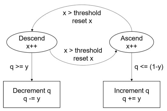 Quality of Service (QoS) offered by a POI during an iteration is represented by a variable q. It is an important factor, which is directly related to vehicle experience. This work avoided assigning a static value (variability equals 0) to each POI, as it lacks realism. It also deliberately avoided using a fully stochastic value, which helps in accommodating human control. The intervention of the authorities is needed when the value of q for an inspected POI reaches the maximum value. In normal circumstances, the q value changes based on the logic presented in Figure 2. Figure 2 shows that a POI is either in Descend or Ascend state. It decreases or increases at a constant rate y, accordingly, for some time, until the counter x is less than a threshold. When it reaches the threshold, it switches to the opposite state. Hence, there are chances that a POI with a certain q value and in descending mode can, at once, switch to ascending mode. Thus, the quality variability mechanism promises a previously under-performing resource to perform better now, and vice versa.