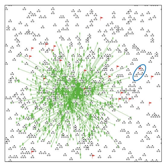 To evaluate the effectiveness of the proposed model, the simulation in NetLogo uses a regular square shaped space, comprised of 77 × 77 cells. Three different types of agents are used by the model to represent persons, vehicles, and POIs. Figure 3 provides a view of the simulation environment. The vehicles can be clearly identified, which are either at homes or at POIs. The POIs are marked as red flags. Co-located vehicles at a POI provide opportunity for SIoV to grow. One such instance of geographically co-located vehicles is illustrated with the help of a blue oval. Persons and vehicles have one-to-one relationships. The persons have their own SNs, which are developed as a result of their preferential attachments. Such networks are also shown in Figure 3, where the size of a person represents its degree of connectivity. It is clear that the SN is completely independent of geography and SIoV.