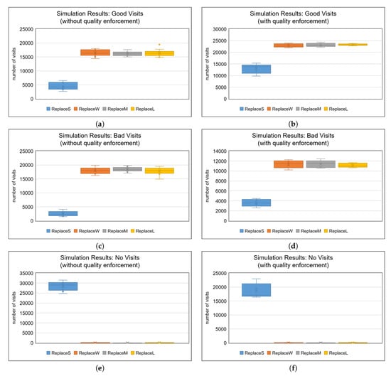 Comparison of the replacement strategies (b,d,f) with and (a,c,e) without quality enforcement based on Good, Bad, and No Visits.