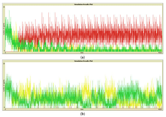 Illustrating Good (colored green), Bad (colored yellow), and No Visits (colored red) without quality enforcement using time series for: (a) ReplaceS strategy and (b) ReplaceW strategy.