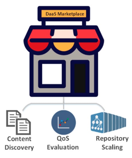 Although there is significant work on the conversion of data as a product in the context of Data Marketplaces (also described in Section 2), in many sectors (critical infrastructure, edge, cloud, and fog computing) the data are evolving in a direction where static data degenerate to hold no value. These types of sectors require a service-based model for data delivery in order to explore the huge amount of data that is created and processed in real time []. This new era of data has created the need for Data Marketplaces that not only deliver data as a product but most importantly create DaaS products [].
