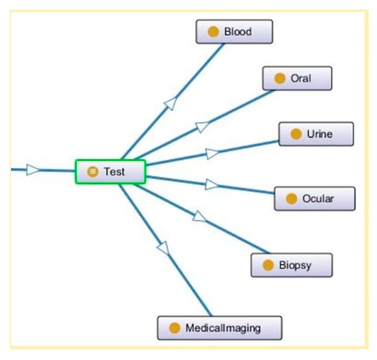 The use case DaaS platform adopts the Service-Oriented Computing principles [], one of which is visibility. This requires the publication of the description of a service in order to make it available to all its potential buyers. In this case, this is fulfilled via the so-called VDC Blueprint that is created and published by the data owners. The Virtual Data Container (VDC) provides an abstraction layer that takes care of retrieving, processing, and delivering data with the proper quality level, while in parallel putting special emphasis on performance, security, privacy, and data protection issues. Acting as middleware, it lets the data consumers simply define their requirements of the needed data, expressed as data utility, and takes the responsibility for providing those data timely, securely, and accurately, while also hiding the complexity of the underlying infrastructure []. Following the general definition of the VDC, its corresponding Blueprint is a JSON file that describes, except for the implementation details and the API that the VDC exposes, all the attributes and properties of the VDC, such as availability, throughput, and price []. This part is critical for the VDC to be considered as a product with specific characteristics that could be used as information metadata by the data buyers. The Blueprint consists of five distinct sections, each one of which provides different kinds of information regarding the VDC. Although a thorough analysis of those sections is outside the scope of this paper, the separation is mentioned in order to highlight that the Semantic Resolution Engine parses only the specific section of the Blueprint that refers to the content of the data that the VDC provides, thus enhancing the scalability of the overall system. Inside this Blueprint section, the data owners use descriptive tags (keywords) in order to make their data more discoverable in terms of content. Given the Blueprint’s creation and storage in the repository, the engine is responsible for finding the most appropriate Blueprints based on the content of data that the VDC delivers. This resolution process takes as input some terms as free text from the data consumers and then provides a list of candidate Blueprints that match one or many of those terms. The returned Blueprints are ranked based on their scores that reflect the level of matching against the set of user terms. For the Blueprint retrieval, the engine relies on ElasticSearch [], which is one of the leading solutions for content-based search. However, in order to enrich the resolution results, meaning more Blueprints that the data consumer might be interested in, the Semantic Resolution Engine exploits the class hierarchy that the ontologies provide. When the consumer provides the input terms, the engine forms the query for the ElasticSearch database, also taking into account semantic relations of those terms. Those relations are extracted from Domain-Specific Ontologies (DSO), which domain experts provide to the marketplace. For instance, in the case of the e-health domain, when a doctor is looking for data about patients’ tests, the engine also returns Blueprints that contain the Blood, Oral, Urine, Ocular, etc. tags, since those are subclasses of the superclass Test (Figure 2).