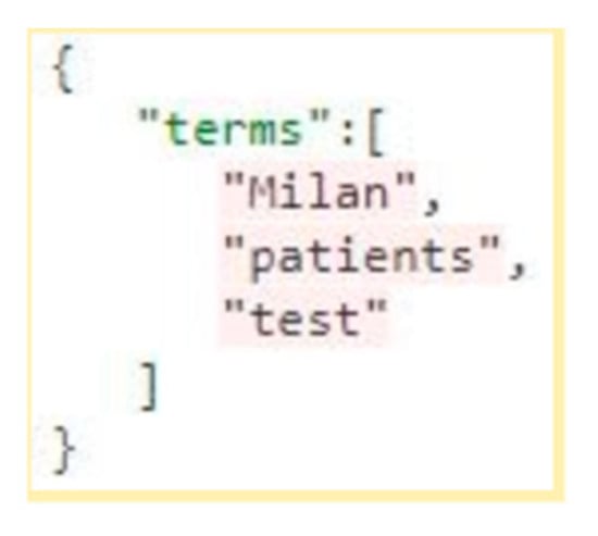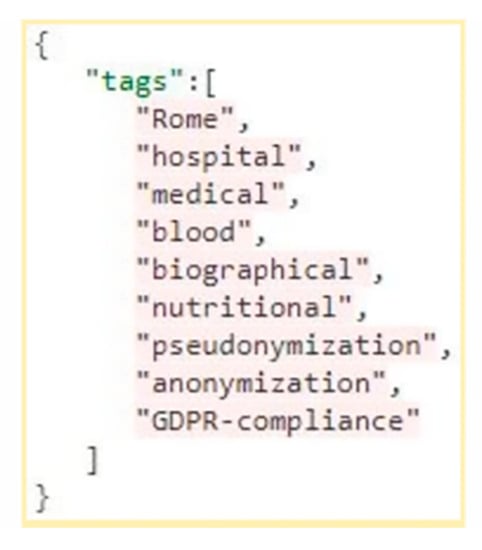 In the following running example, the DaaS Marketplace aims at delivering medical data to various users such as doctors, researchers, or any developers that intend to create cloud-based applications which would consume those data. The storyline begins with a domain expert (i.e., doctor, biomedical engineer, etc.) that provides the relevant DSO to the marketplace. Thereafter, data owners that are willing to sell medical data via the Marketplace, create and store their Blueprints in the repository. As mentioned before, a Blueprint contains, among other tags, those that describe the content of the data that the VDC provides. An example of those tags is depicted in Figure 6.