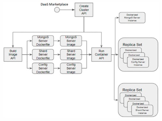 We will focus on the Docker and Scaling APIs as these are being used in the evaluation run in the present work. As shown in Figure 9, the three APIs that are being used during the deployment face of the MongoDB cluster are the Create Cluster API, the Build Image API and the Run Container API. The first receives a JSON file that contains the initial configuration of the cluster to be created. This includes the machines used, the ports, the IP addresses, their roles (Mongos server, Configuration server, or Shard server), and other relevant information. Then, this API uses the Build Image API in order to ensure that all necessary images are present in the Docker hosts and that they are ready to spawn new containers. If an image is not present it is automatically created using pre-created Dockerfiles that are populated by the configurations passed to the Create Cluster API. Then, the Run Container API is called, which starts the necessary containers and configures the MongoDB cluster, returning the final access point and a debug status message to the user who, in this case, is the DaaS Marketplace.