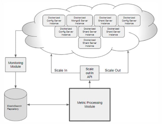Docker is a tool providing virtualization technology that creates lightweight, programmable containers, based on pre-created images []. Combining the fast and efficient virtualization technology that Docker provides, we can exploit the sharding capabilities of MongoDB in order to automate the scale out and scale in functions of the MongoDB cluster during runtime, according to the real-time performance data of the cluster. Docker has been used in order to automate the setup of MongoDB and Cassandra clusters [,] and to provide a micro-service architecture [], but to our knowledge it has not been used to combine these two together to provide real-time modifications to the MongoDB cluster (creation, destruction, scaling out, and scaling in).
