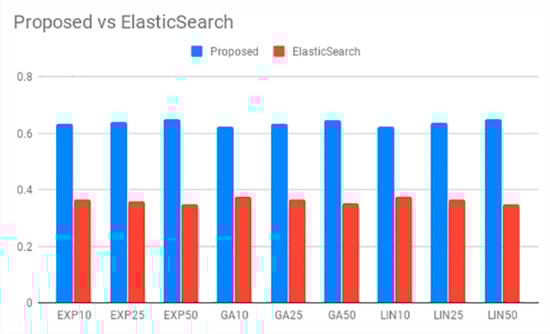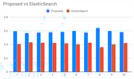 We also performed the same experiment using the 10-fold cross-validation methodology on the GA10 algorithm of ElasticSearch versus the proposed system, to evaluate the behavior on queries without an exact match in the ElasticSearch data indexes. The results are now more in favor of ElasticSearch, lessening the difference in percentages. Nonetheless, there is a clear superiority of the proposed system in all cases as shown in Figure 12.