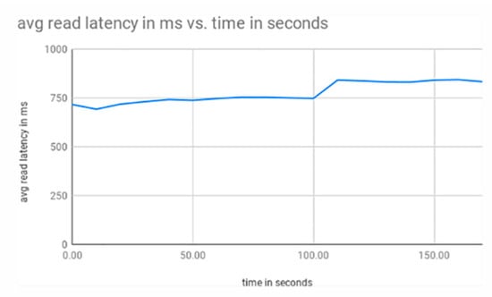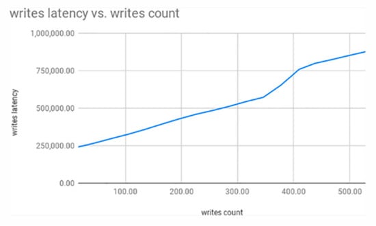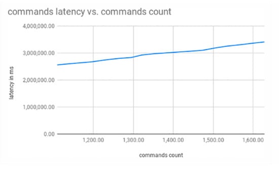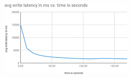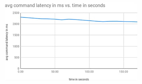 The same is not true for the average latency per operation. We notice that in read operations, the average latency increases as more requests come in (Figure 16), while in command operations it appears to be reducing (Figure 17). For write operations, we notice a logarithmic graph (Figure 18), possibly due to caching of the semi-randomized values created by the artificial load scripts.