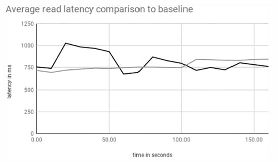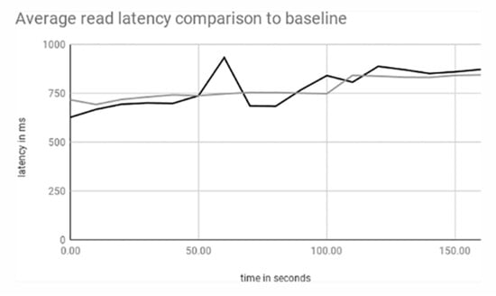 Average read latency of twice scaled cluster versus the baseline, single shard cluster.