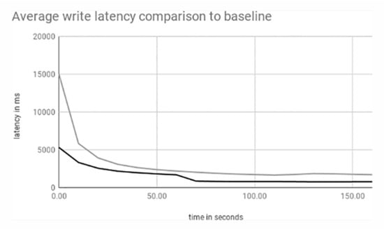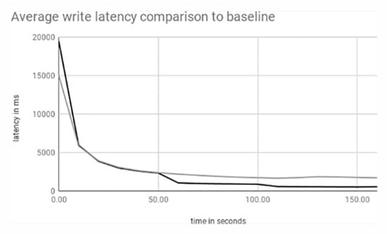 Average write latency of twice scaled cluster versus the baseline, single shard cluster.