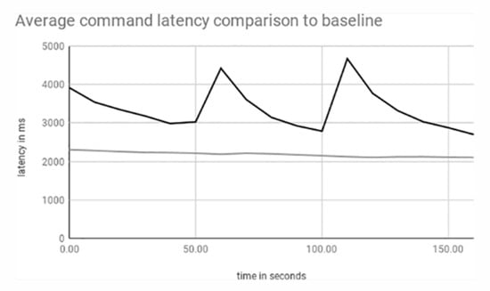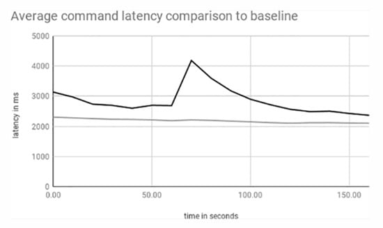 Average command latency of twice scaled cluster versus the baseline, single shard cluster.