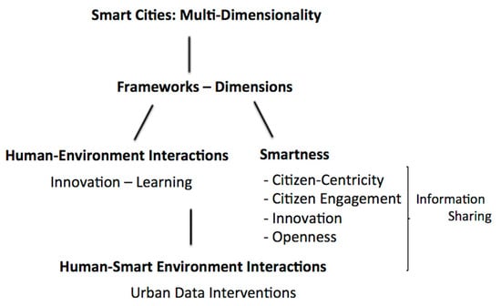 Wong, Law, and Huang [5] note that, “a construct is multidimensional when it consists of a number of interrelated attributes or dimensions and exists in multidimensional domains” drawing on the work of Law, Wong, and Mobley [6]. In developing the multidimensional domain of the smart city, Nam and Pardo [7] conceptualize three dimensions of a smart city as technology, people, and institutions, while Gil-Garcia, Zhang, and Puron-Cid [8] conceptualize the construct of smartness in the institution of government as multidimensional, consisting of 14 dimensions. As such, Figure 1 provides an illustration of how the literature review that follows is organized to categorize elements that are associated with the multi-dimensionality of smart cities, including the exploration of frameworks and dimensions, contributing to evolving and emerging directions based on selected elements of the dimension of smartness (where information sharing figures strongly [8]), such as citizen-centricity, citizen engagement, openness, and innovation. This review and background opens spaces for the evolving of frameworks, such as human-environment interactions (HEI) to that of human-smart environment interactions (HSEI) in support of innovation and learning and urban data intervention potentials.