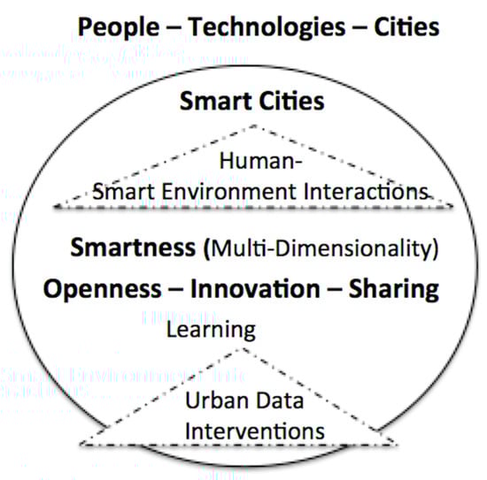 A review of the research literature focusing on the dimensions and multi-dimensionalities of smart cities and interactions enables the formulation of a conceptual framework for human-smart environment interactions (HSEI), as depicted in Figure 3. Through the dynamic of people–technologies–cities, HSEI in the form of the multi-dimensional construct of smartness, involving relationships between selected dimensions (e.g., openness and innovation, innovation and sharing, etc.) are explored. An exploration of the dimensions of smartness in terms of relationships also contributes to learning as well as opportunities for engagement with initiatives in support of urban data intervention potentials.