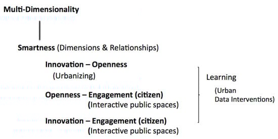 Relationships between selected dimensions of smartness in urban human-smart environment interactions matter for—openness and innovation; openness and citizen engagement; innovation and citizen engagement; innovation and sustainability, etc.—contributing to ways for learning about and understanding the multi-dimensionalities of smart cities, their interdependencies, and urban data intervention potentials.