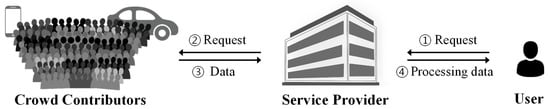 Mobile crowdsensing (MCS) technology is a paradigm that has emerged with the development of mobile devices and mobile communication technologies, such as smartphones and cars, with high processing speeds and multiple sensors. As shown in Figure 1, MCS technology has a structure wherein the service provider collects and processes the sensing data generated by using the sensing, computing, and communication functions of the corresponding devices of a crowd, and provides a new service to users based on these data and functionalities. The characteristics of MCS, compared to those of traditional wireless sensor networks, have been presented in past literature []. Among these, we introduce four MCS characteristics related to the system proposed in this paper.