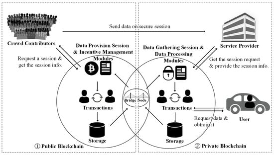 Figure 2 shows the overall schematic structure of the system proposed in this paper. Arrows indicate the direction of the process of data exchange between the objects. ① is a public blockchain, in which the session management for data provision module and the incentive management module operate, and ② is a private blockchain, in which the session management for data gathering and the data processing module operate.