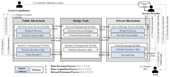 Figure 3 is a structural diagram of the proposed system, showing the functional modules and data flow of each entity with which the contributors, service providers, and users interact, and the bridge nodes through which the two blockchains communicate. The functions in the module of each blockchain can be implemented as smart contracts, and the functions of the bridge node can be implemented as a process. The overall processes of the proposed system consist of the following: the data provision process (1.1.1–1.3.2), data acquisition process (2.1.1–2.2.2), and reward payment process (3.1.1–3.2.2).