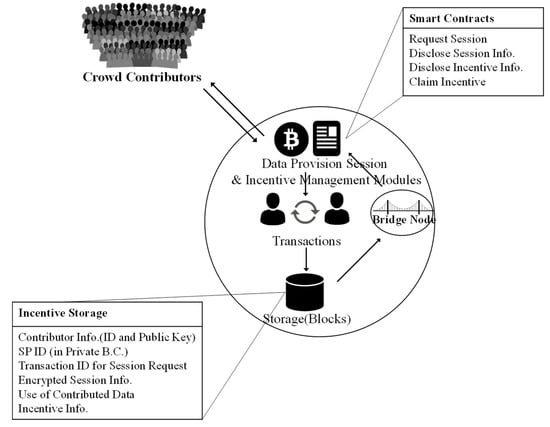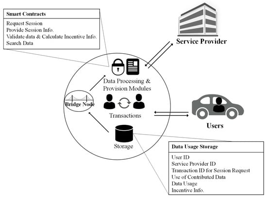 As shown in Figure 5, the private blockchain consists of service providers, service users, bridge nodes, and smart contracts for session management and data processing. The purpose of a private blockchain is to support the service provider in gathering the data from contributors and to deliver information to the users who request for it; a private blockchain records the data delivered from the contributors to the users who need the data, and leaves a record to reward the contributors who provided the data.