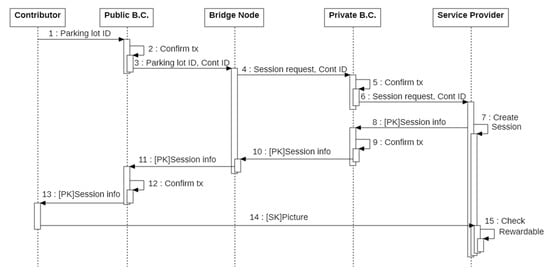 Therefore, a contributor requests a session for directly delivering unstructured data to a service provider through a smart contract, as shown in Figure 6. The “Confirm tx” in the sequence diagrams refers to the transaction confirmation, whereas “[PK]information” and “[SK]information” denote the information encrypted with the public key and the session key, respectively. The contributor transmits the information of the service provider and his own public key together through the session request contract of the public blockchain. When the content is confirmed in the public blockchain, the bridge node delivers the content to the private blockchain. When the delivered transaction is approved again, the service provider creates a session, encrypts a session key and the session information with the public key received with the identification information of the contributor, and sends it back to the blockchain. The contributor decrypts the session information, with which the photo would be delivered through the encrypted session information, and directly transmits the data through the session.