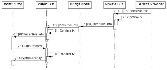 The service provider who receives the photo from the contributor determines whether the photo actually helps other users (e.g., checking the photo if it matches the location, or checking the hash code for the received information). The result of the validity judgment of the picture is stored in a transaction, to allow the reward to be delivered to the contributor, as shown in Figure 7. The service provider performs a transaction on the private blockchain that indicates that the contributor can receive the reward, without directly exposing the reward information of the specific contributor to the public blockchain, through the smart contract (i.e., encrypting the information in the transaction with the public key of the contributor that provided the data). The bridge node executes the “Disclose Incentive Information” contract in the public blockchain (i.e., changing its contents to a request to transmit actual cryptocurrency to the public blockchain) and thus leaves the incentive information in a block. Afterward, the contributor claims the reward and obtains the actual cryptocurrency.