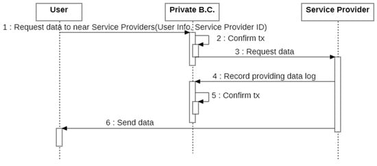 Users belong to the private blockchain and can request data. The requested data are directly acquired from the service provider, as shown in Figure 8.