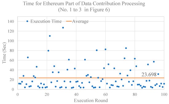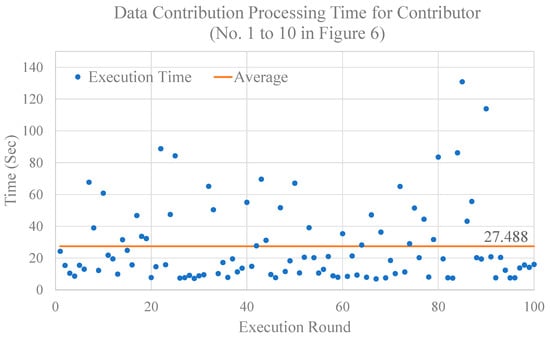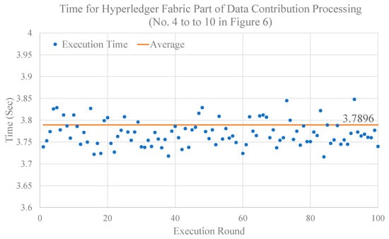 Figure 10 and Figure 11 show the execution time portions for data contribution processing for each execution in Ethereum (1–3 in Figure 6) and Hyperledger Fabric (4–10 in Figure 6), respectively. These time portions are measured when the process has been divided into the Ethereum and Hyperledger Fabric parts. The average and standard deviation for the Hyperledger Fabric data in Figure 11 are approximately 3.7896 and 0.197, respectively, whereas the average and standard deviation of the execution time in the Ethereum portion, shown in Figure 10, are 23.698 and 24.757, respectively. Through this experiment, most of the execution time of the blockchain-based application was observed to be highly dependent on the transaction speed of the public blockchain Ethereum; i.e., fluctuating and time consuming. When these results are analyzed, they can be found to reflect a case where block creation consumed a large amount of time while being pushed from the priority of other transactions in the Ethereum test network. Unlike in the test network, if the transaction is performed on the main network of Ethereum, the block creation time will be about 15 s [], resulting in uniform results. Moreover, if another blockchain with a faster block creation time (e.g., ripple, with as little as 3.5 s []) were to be used for the public blockchain part of the proposed system, the execution time could be reduced.