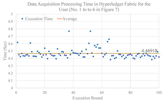 Figure 12 shows the amount of time for the user to request 10 instances of data and receive them (numbers 1–6 in Figure 7). The graph shows that the standard deviation is small and that it takes the quantitative time. That is, it is possible to confirm a fast and stable execution in the Hyperledger Fabric for the data acquisition of the user.