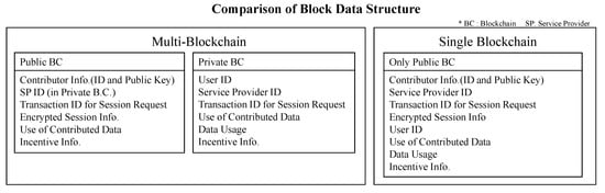 Comparison of block data structure in multi-blockchain and single blockchain.