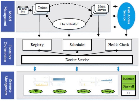 In addition to the aforementioned requirements, the computing platform needs to process the data near the data source, because enterprises do not want data to be uploaded to the cloud platform from the perspective of security and privacy. This platform that nears the data source can avoid data leakage and reduce transmission delay. However, this platform generally has limited resources, so it should also provide functions related to the general computing demands, e.g., computing resource allocation and isolation. Due to the model complexity and the large scale of data, trainers’ executions consume considerable CPU, GPU, disk and memory resources. Thus, it important to orchestrate the execution of trainers to avoid excessively resource consumption. To achieve maximal flexibility, the existing cloud, fog and edge computing platforms mainly adopt the virtualization techniques, e.g., Hypervisor [] (system-level virtualization) and container technologies [] (operating-system-level virtualization). With the maturity of lightweight container technology, platform architectures [,] prefer the container techniques such as Docker instead of traditional VM. In the following subsection, a Docker-based service architecture is introduced.