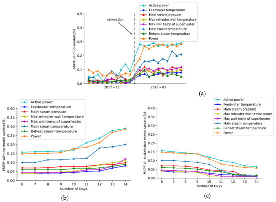 Model evolution and effects of model update. (a) Model evolution before/after the renovation; (b) Mean Absolute Percentage Error (MAPE) without sustainable model update; (c) MAPE with sustainable model update.