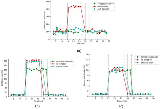Average predictive delay and resource utilization in different isolation environments. (a) Prediction delay; (b) CPU Utilization; (c) Memory Utilization.