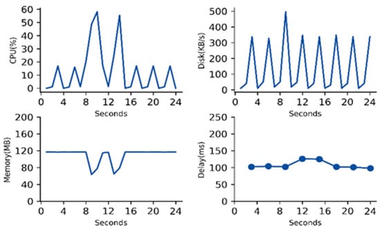 After the newly generated model passed the offline and online validation, the orchestrator will replace the old model which is serves as its corresponding modelet. Figure 6 presents one modelet container load changes and model prediction delay during model switching (one point/3 s). From the proposed master–slave design, when the master port is restarted, the newly generated model is loaded, causing the CPU to rise quickly and form the first peak. Due to the existence of the hot backup model, two models are stored in the memory of the modelet. With the release of the memory of the master port model, the modelet memory usage drops rapidly and generates a trough. In order to ensure that the master port serving the new model can be predicted normally, we set the interval, restarting the hot backup model to 4s. The reason why the CPU generates the second peak and the corresponding memory trough is due to the restarting of the slave port and the updating and loading of the hot backup model. Although the occupancy rate of the CPU increase, the isolation feature allows the impacts to be limited to within only one core during the entire switching process. The model used for experiment is about 176 KB, which caused Disk to generate 158.6 KB/s extra overhead when the model was switched. However, since the newly generated model already has a cache in memory, the model update of the salve modelet does not need to read it again. That is why the disk i/o displays a single peak.