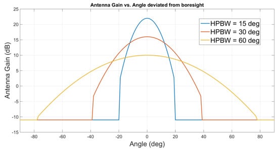 Figure 1 shows the radiation pattern of basic and switched directional antennas with , and of half power beam width (HPBW), denoted as . Equation (6) shows the radiation pattern in decibels [30], where is the maximum gain and is the averaged gain values at the sidelobe.