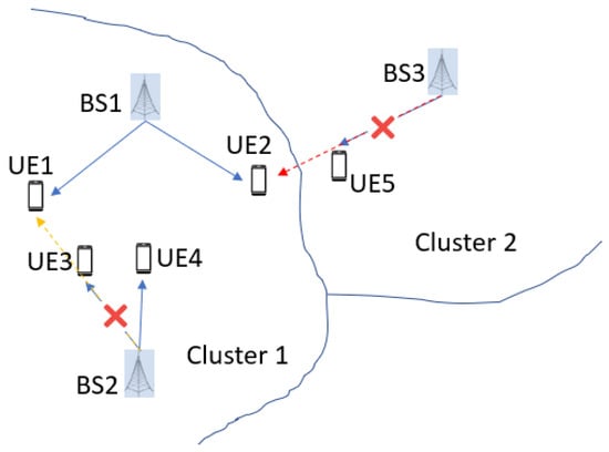 Figure 4 shows how interference affect both intra-cluster coordination and inter-cluster coordination: in cluster 1, BS1 schedules UE1 and UE2, when BS2 schedules UEs, the intra-clustering algorithm skips UE3 because it causes high interference to UE1 who is already scheduled, and schedules UE4. In cluster 2, BS3 schedules UE5. During inter-cluster coordination, UE2 is found to have low SINR and its interferer UE5 is unscheduled to reduce interference.