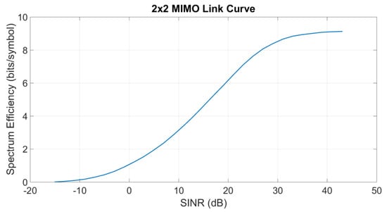 Each radio frame is 10 milliseconds, consisting of one hundred 0.1 millisecond time slots. The spectrum is split into resource blocks (RBs) of 900 KHz, each RB is split into 12 subcarriers. LTE TDD subframe configuration 2 with 0.75/0.25 downlink/uplink ratio, 64 quadrature amplitude modulation, 2 × 2 MIMO with closed loop spatial multiplexing transmission mode 4, control format indicator 1, and extended pedestrian A 5 Hz multipath model have been assumed. The max transmit power per sector is 47 dBm. Figure 5 shows the link curve based on above assumption from [23] assuming 10% of packet error rate.