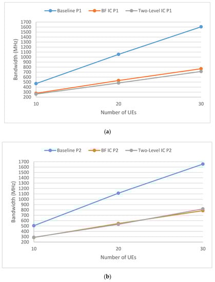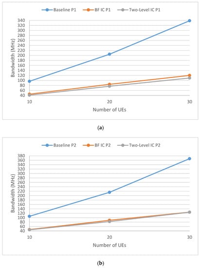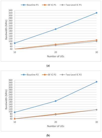 Figure 6 shows the comparison of the bandwidths required for different IC approaches for the virtual reality service (S1) with a 25 M data rate, 20 ms delay budget (90 frames per second (FPS) with 11 ms frame delay and 9 ms transmission delay), and a packet loss rate of . This scenario simulated a network with a cell radius of 100 meters (ISD = cell radius × ), 10/20/30 UEs per sector, 4 beams to horizontally cover the sector area, a maximum 3 sectors per cluster, and a maximum of 4 MU-MIMO users per sector. Ten simulations were run with different random seeds, and the results were averaged. The baseline approach is an approach in which no interference coordination is performed. The coordinated beamforming IC approach (BFIC) is a one-level IC approach with intra-cluster interference coordination only. The proposed two-level IC approach, together with the BFIC approach, show improvement in the required bandwidth compared to that of the baseline approach. The two-level IC-P1 approach achieved the minimum required bandwidth, but the two-level IC-P2 approach was worse than the BFIC-P2 approach because of the capacity loss the approach caused.