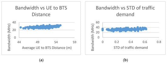 Selecting the two-level IC-P1 approach that achieved the minimum required bandwidth, Figure 9 shows the scatter plot of 200 drops with different random seeds. For simplicity, we fixed the cell radius to 100 m, the average number of users per sector at 10, the beams to cover the sector area at 8, and the service as S2 (interactive gaming service). For network design, as explained in Section 3, for each data point (s, u, b, isd, dis, and varT), the maximum required bandwidth is calculated to create the performance model.