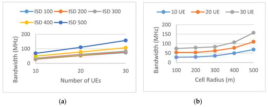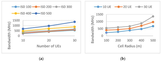 Design performance model of the Mixed Traffic service. The sub-figure (a) shows required bandwidth vs. number of UEs per sector at different ISD, the sub-figure (b) shows required bandwidth vs. cell radius at different number of UEs per sector.
