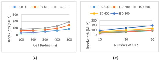 Design performance model of the Virtual Reality service. The sub-figure (a) shows required bandwidth vs. number of UEs per sector at different ISD, the sub-figure (b) shows required bandwidth vs. cell radius at different number of UEs per sector.