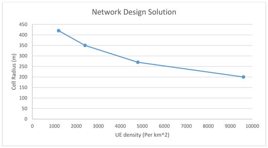 Figure 10, Figure 11 and Figure 12 show the network design performance model, simplified by fixing the traffic demand variance varT and the number of beams to 8. The number of UE and the ISD (or the cell radius) were varied with discrete values, and for each data point of (u and isd), 50 drops were run. Figure 13 shows an example of design solution using the performance models in Figure 10, Figure 11 and Figure 12. The SLA requirements include varied UE density (we assume the same UE density among all three scenarios, i.e., N UE per sector for S1, N UE per sector for S2, and N UE per sector for S3 plus S4) and total available bandwidth of 1 GHz. A network design solution was to find an ISD in which the bandwidth was shared among services. In all three scenarios specified in Figure 6, Figure 7 and Figure 8, the UE covered by the sites fulfilled their QoS requirements.