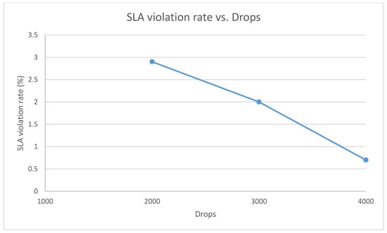 Figure 14 shows the SLA violation rate using a performance model. For simplicity, we fixed the cell radius to 100 m, the average number of users per sector at 10, the beams to cover the sector area at 8, and the service as S2. The first 1000 drops were used to generate the initial performance model. For each new drop, dis and varT were used to search the performance model for a solution and verified whether the solution fulfilled the QoS requirements. If not, a new solution had to be found using Algorithm 4 in Section 3, and the performance model updated. The figure shows that as more drops were run, the rate of successful prediction increased.