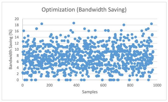 The same setup in Figure 14 is in Figure 15, to show the network optimization results for 1000 random drops. On average, a bandwidth saving of 7.5% was achieved, which shows that the bandwidth we used for the initial design is as close to the optimized bandwidth as we can achieve.