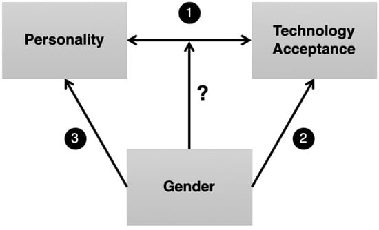 With respect to the possible moderating influence of gender on the personality-TA relationship, we only identified one finding in the scientific literature. In a study on the role of personality in TA decisions, Devaraj et al. [] only write: “A one-way analysis of variance (ANOVA) of differences in responses between males and females in the sample supports the conclusion that gender does not play a significant part in our research model and results.” (p. 98). Further analyses (e.g., on an actual moderation effects of gender), results, or comments are not provided in the paper. What follows is that we know very little about the possible moderating influence of gender on the personality-TA relationship (see the question mark in Figure 1).