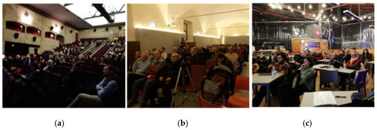 Different modalities of Science cafés: (a) in a conference room of the public Library “Oblate”, in the center of Florence; (b) a Cine-science at the Cinema “La Compagnia”, Florence; and (c) a science café in the Central Market of Florence.