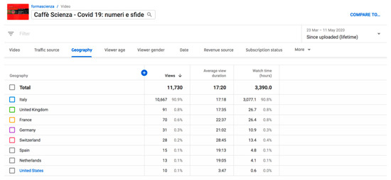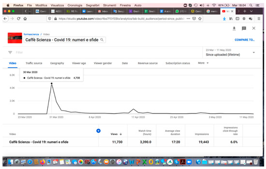 It is very interesting to see, thanks to YouTube analytics, that, immediately after the live streaming, 3000 other people followed the video, and that views continue to increase every day, with a peak in correspondence with the report of the Science Café published on ww.post.it (17 April 2020) (see Figure 2).