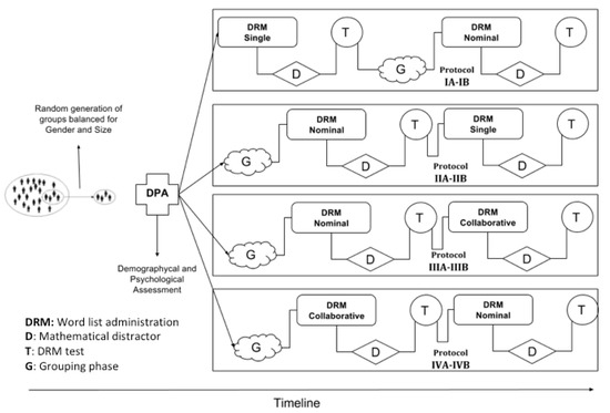Experimental design. Note. In figure, the entire procedure for each protocol (i.e., Protocol IA-IB; Protocol IIA-IIB; Protocol IIIA-IIIB; Protocol IVA-IVB) is reported. Groups (i.e., subsamples) were balanced for all conditions (i.e., word list, order of experimental conditions, group size and gender composition).