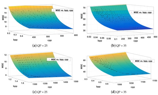 where , , , and are the appropriate model parameters for that CTU. Here, and are the bpp and cpp calculated as the averages of the minimum and maximum of each respective parameter observed so far within the encoded sequence for the kth QP for a given frame type. Next, the actual MSE of the co-located CTU, , is then compared with for all QPs to obtain a QP such that